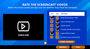 I recorded screen capture videos with Camtasia and Loom and developed the interactive content in Articulate Storyline. Learners were provided with a variety of activities including click-to-reveal interactions, knowledge check quizzes, a mini-scenario, videos, and job aids.